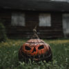 Bloody accented and black washed pumpkin with a stitched mouth & flickering light up interior.